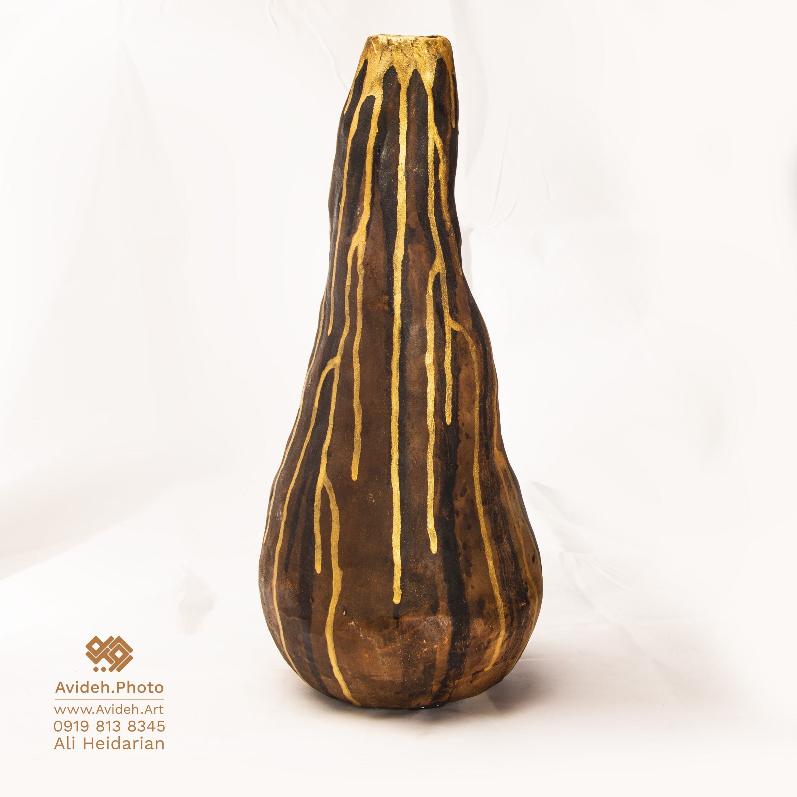این اثر هنری یک گلدان دفورمه از جنس سفال پخته شده با رنگ اکریلیک قهوه ای میباشد با طرح طلایی بصورت آتشفشان که داخل آن ضد آب نمیباشد. برای محافظت در برابر مواد شیمیایی و رطوبت و درخشندگی بیشتر روی محصول با لایه ای از ورنی پوشیده شده. زیر گلدان یک لایه لاستیکی قرار دارد که از ایجاد خش روی میز جلوگیری میکند.